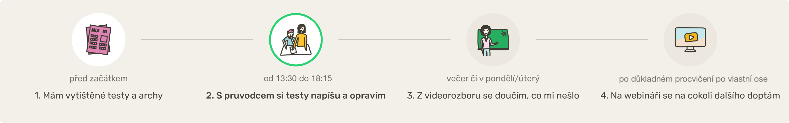 Testy CERMAT jsou velice specifické a žáci na jejich formát a pravidla nejsou zvyklí. Spousta žáků při zkoušce nepohoří na nedostatku znalostí, ale na tom, že neumí pracovat s formátem záznamového archu (vyžaduje přesné křížkování, obtahování rýsování propiskou, zakázána jsou gumovací pera, bělítka atd – jejich použitím se může arch znehodnotit a žák má 0 bodů). Proto je nutné práci s archem trénovat, na což se mi důsledně soustředíme.
